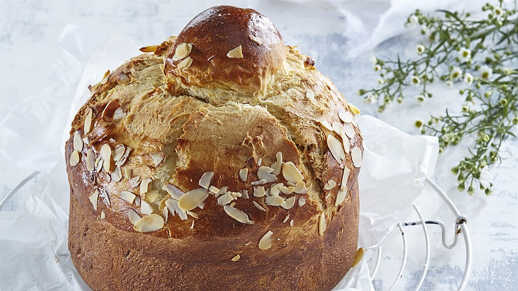 - Pak potřeme povrch rozšlehaným vejcem a posypeme mandlovými lupínky. Pečeme v předehřáté troubě na 180 °C asi 15 minut. Poté teplotu snížíme na 160 °C a pečeme dalších 40 minut. Po upečení necháme mazanec vychladnout a pak ho vyjmeme z formy.