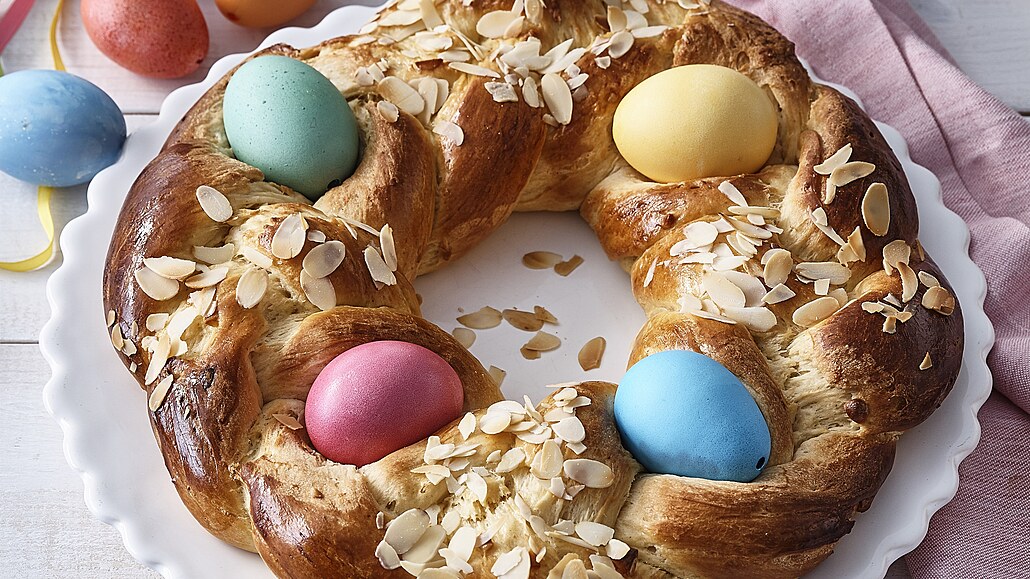- Po nakynutí potřeme věnec zbylým vejcem a posypeme mandlovými lupínky. Pečeme v troubě předehřáté na 200 °C asi 10 minut, pak teplotu snížíme na 180 °C a dopékáme dalších 20 minut. Věnec necháme krátce zchladnout na plechu. Poté ho přendáme na kovovou mřížku a necháme zcela vychladnout. Nakonec odstraníme formičky a věnec ozdobíme kraslicemi.