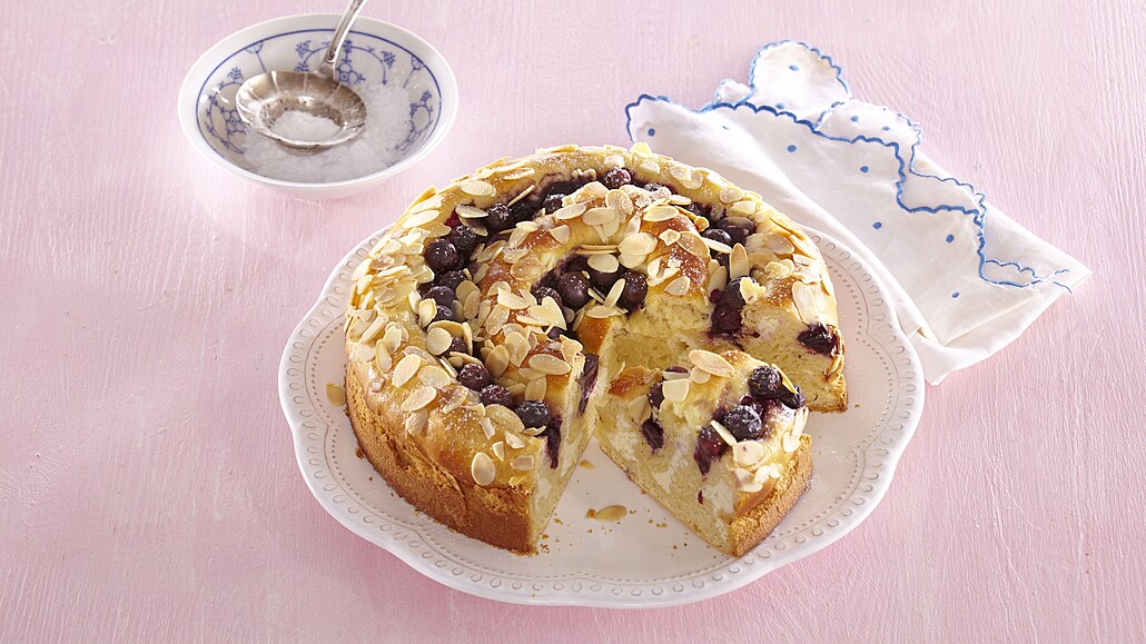 - Do mezer nasypeme borůvky a lehce je přitiskneme. Nakonec koláč potřeme rozšlehaným vejcem a posypeme mandlovými lupínky. Koláč necháme 15 minut kynout a pak pečeme v předehřáté troubě při 160 °C asi 50 minut. Hotový koláč po vychladnutí lehce pocukrujeme.