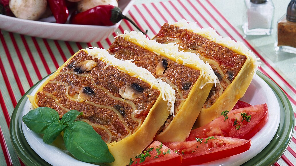 - Takto připravené lasagne vložíme do trouby, rozehřáté na 170°C a pečeme asi 40 minut. Hotové vyndáme z formy, nakrájíme na plátky a horké servírujeme.