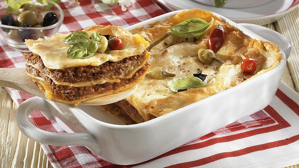 - Zapékací misku (24x16 cm) vymažeme tukem, na dno rozetřeme 1/4 bešamelu a na něj rozložíme 3 plátky lasagní. Přidáme další 1/4 bešamelu, pak 1/2 směsi s mletým masem a opět překryjeme 3 lasagněmi. Tento postup ještě jednou zopakujeme a povrch potřeme zbylým bešamelem. Posypeme zbytkem parmazánu a pečeme ve vyhřáté troubě při 200 °C asi 40-45 minut dozlatova. Ozdobíme bylinkami, olivami a feferonkami.