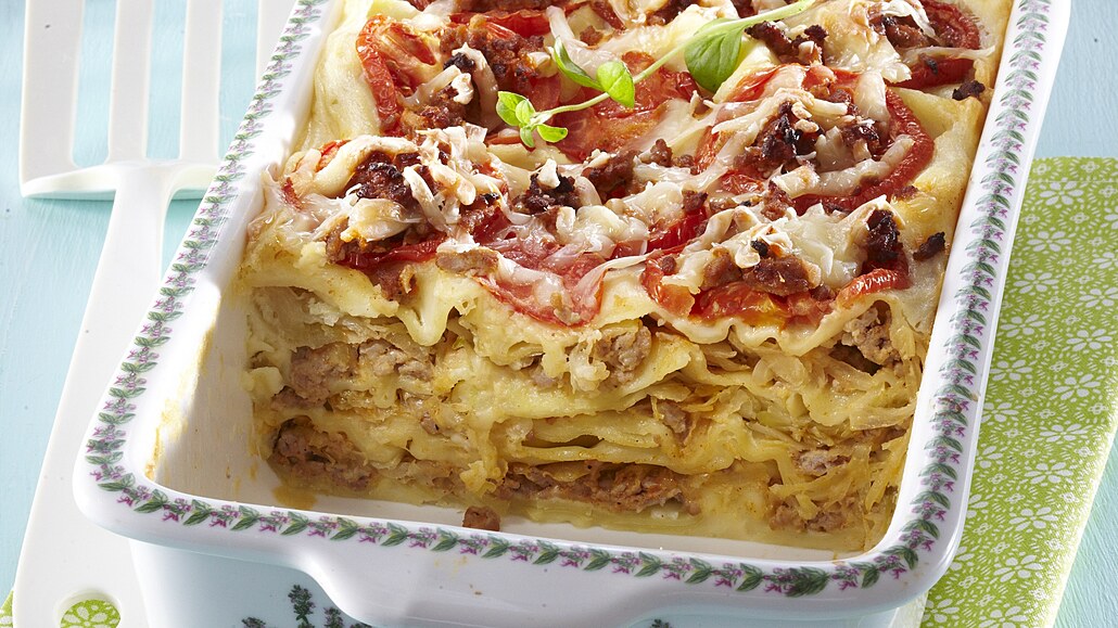 - Na dno zapékací misky nalijeme trochu bešamelu a rozložíme několik plátků lasagní. Pak přidáme část masa a zelí. Vrstvení opakujeme do spotřebování ingrediencí. Navrch rozložíme na plátky pokrájená rajčata a nasypeme sýr. Lasagne zapékáme v troubě při 180 °C asi 40 minut.