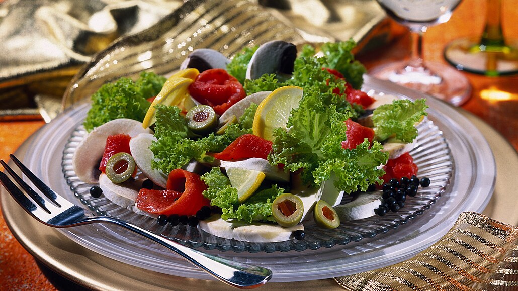 - Listy salátu úhledně rozdělíme na talířky a poklademe plátky žampionů, kousky lososa a olivami. Vše pokapeme zálivkou, dozdobíme plátkem citronu a podáváme.