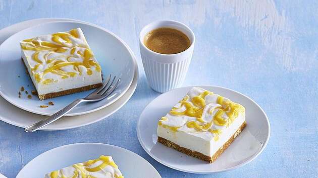 - Pak vmícháme šlehačku vyšlehanou dotuha. Hotový krém rozetřeme do formy s nepečeným korpusem. Povrch uhladíme a přestříkáme prošlehaným lemon curd. Špejlí lehce promícháme, aby se vytvořilo mramorování. Řezy uložíme do chladničky ztuhnout. Po ztuhnutí sejmeme formu a nakrájíme na řezy.