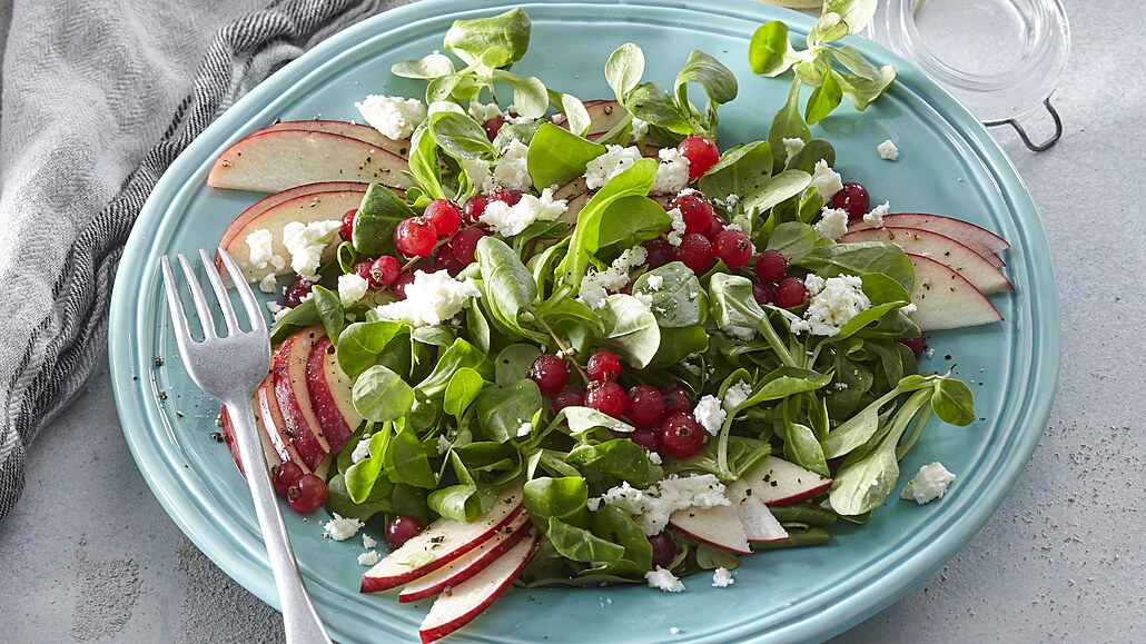 - Polníček střídavě vrstvíme s plátky jablek na servírovací talíř a posypeme je rozdrobeným balkánským sýrem a kuličkami rybízu. Zakápneme připraveným dresinkem a ihned podáváme například s rozpečenou bagetkou.