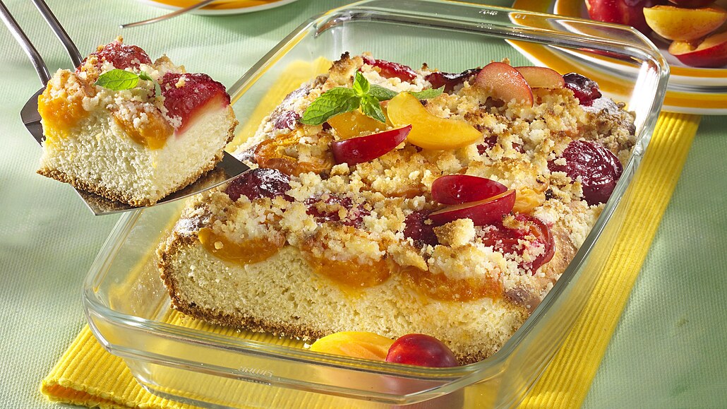 Barevné osvěžení z velkého plechu kombinuje nadýchané kynuté těsto se střídavými řadami šťavnatých meruněk a blum. Bohatá máslová drobenka a jemná vanilková vůně vytvářejí v troubě harmonický celek, který svou poctivostí a ovocnou šťavnatostí představuje vrchol sezónního pečení pro celou rodinu.