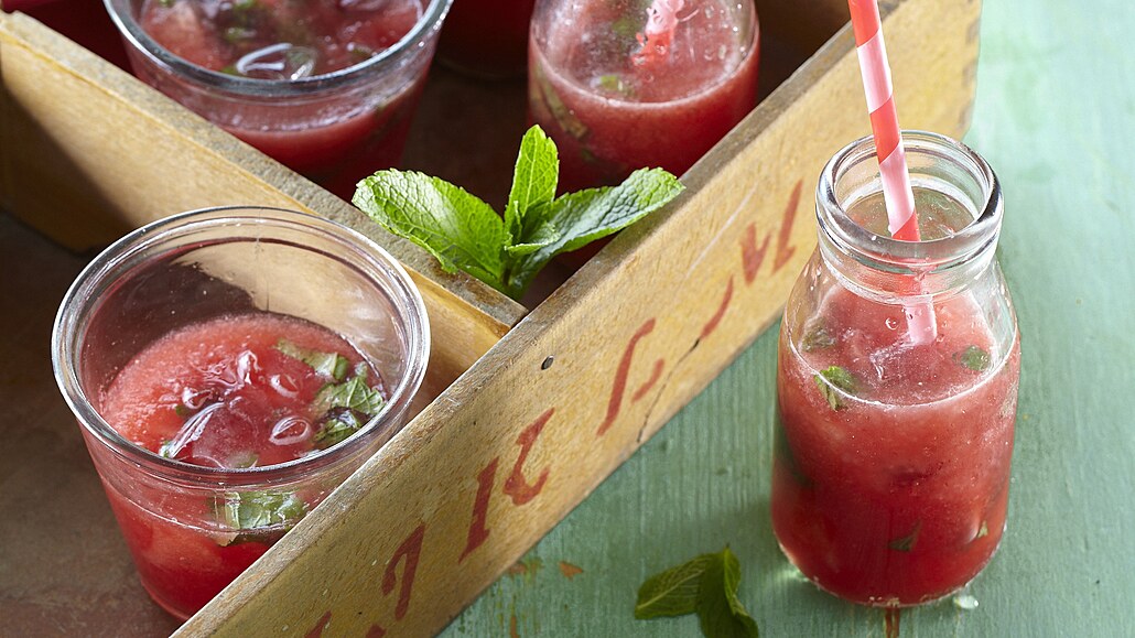 - Do sklenek rozdělíme zbylé kousky melounu a přidáme nasekanou mátu. Zalijeme rozmixovaným melounem a sklenky doplníme ledem. Ihned podáváme ozdobené čerstvou mátou.