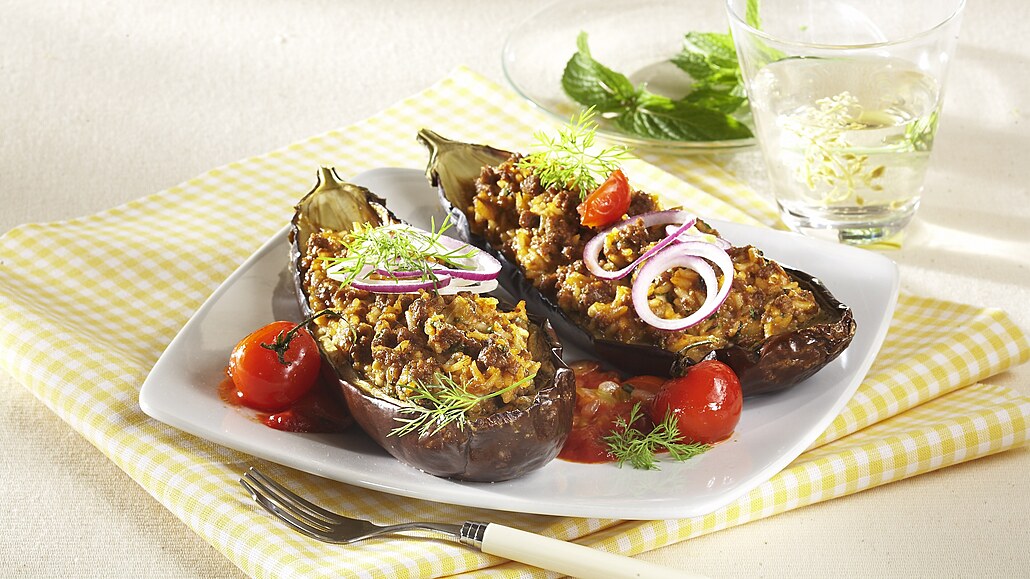 - Vychladlé maso smícháme s rozdrobeným sýrem, vařenou rýží, vejci, rajčatovým protlakem a jogurtem. Vše smícháme s nasekanými bylinkami, osolíme, opepříme a ochutíme špetkou muškátového oříšku. Dužinu z lilků nakrájíme nadrobno a přidáme do masové směsi. Náplň rozdělíme do lilků a zapékáme při 180 °C asi 20 minut. Hotové lilky podáváme s rajčatovou omáčkou a zdobíme kroužky cibule a koprem.