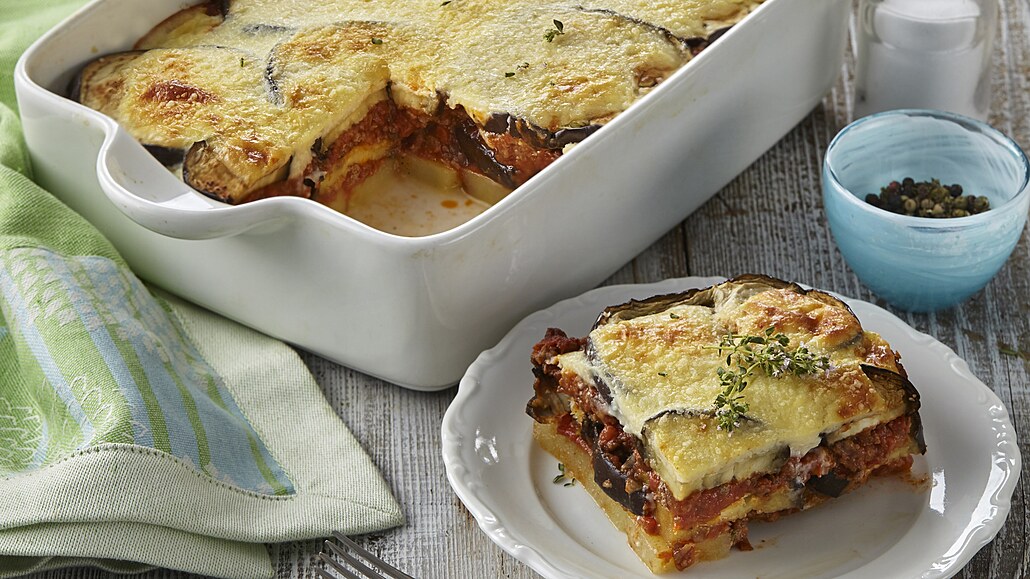 - Mezitím oloupeme brambory, nakrájíme je na plátky a vyrovnáme je na dno zapékací misky vytřené zbylým olivovým olejem. Vrstvu brambor osolíme, přidáme vrstvu masové směsi a nakonec na ni naklademe upečené plátky lilků. Vrstvení můžeme opakovat s tím, že poslední vrstvou je vždy lilek. Přikryjeme alobalem a pečeme v předehřáté troubě při 150 °C asi 45 minut.
