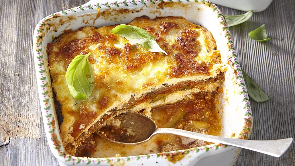 - Pekáček vymažeme silnou vrstvou olivového oleje a na dno rozložíme plátky cuket. Ty překryjeme vrstvou boloňské omáčky, na ni vyskládáme plátky lilku a tu překryjeme smetanovou vrstvou z ricotty a mascarpone. Nakonec posypeme vrstvou strouhané mozzarelly a lístky bazalky.