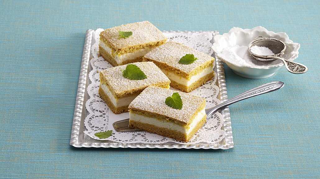 - Odleželé těsto rozdělíme na dva díly. Rozválíme je na obdélníkové pláty silné asi 1 cm. Jedním plátem vyložíme dno pekáčku a rozetřeme na něj tvarohovou náplň. Navrch položíme druhý plát. Pečeme ve vyhřáté troubě při 175 °C asi 45 minut. Necháme vychladnout a nakrájíme na řezy. Před podáváním je můžeme posypat cukrem a dozdobit mátou.
