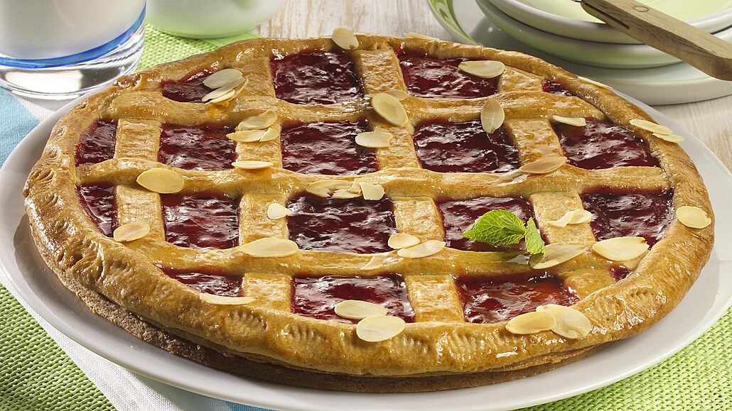 - Ze druhé části těsta opět vyválíme kulatý plát ve tvaru formy. Potřeme ho polovinou džemu, ozdobíme mřížkou, vyrobenou z proužků z poslední části těsta, potřeme rozšlehaným vajíčkem a posypeme mandlemi. V troubě při 200 °C ho pečeme 20 minut.