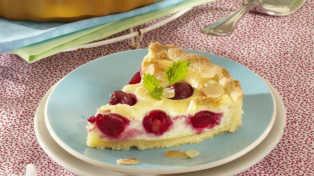 - Na korpus rozetřeme tvarohovou náplň a rozložíme třešně. Vše zasypeme mandlovými lupínky. Koláč při 170 °C dopékáme asi 30 minut.