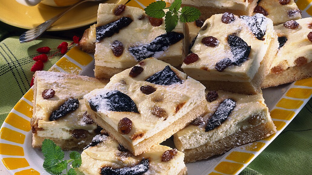 - Tvarohovou hmotu natřeme na zapečené těsto, zapícháme do něj půlky sušených švestek, namočené rozinky v rumu a celý koláč při snížené teplotě na 180 °C dorůžova dopečeme.