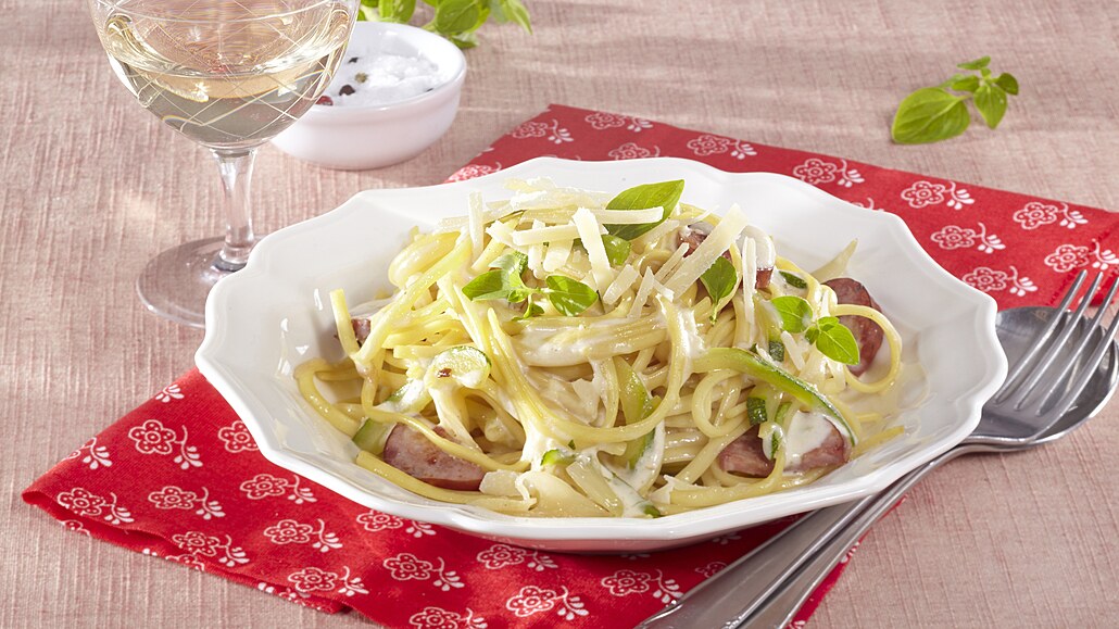 - Těstoviny vložíme do vroucí osolené vody a uvaříme al dente (na skus). Mezitím nakrájíme klobásu na kolečka a cuketu na nudličky. Opečeme je na oleji dozlatova, osolíme a opepříme.