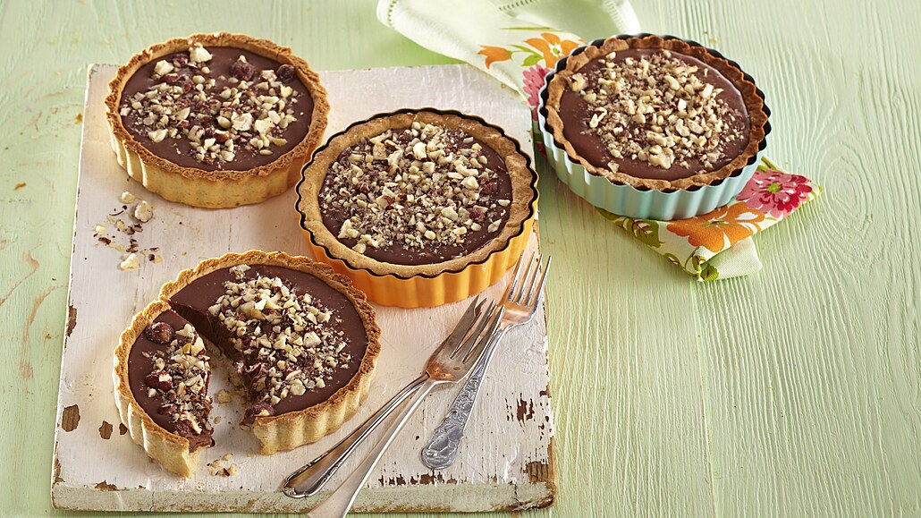 - Zbývající oříšky nasekáme nahrubo. Polovinu jich nasypeme na dno vychladlých korpusů a přelijeme je čokoládovým krémem. Povrch dozdobíme zbylou polovinou ořechů a koláčky necháme zatuhnout v lednici.