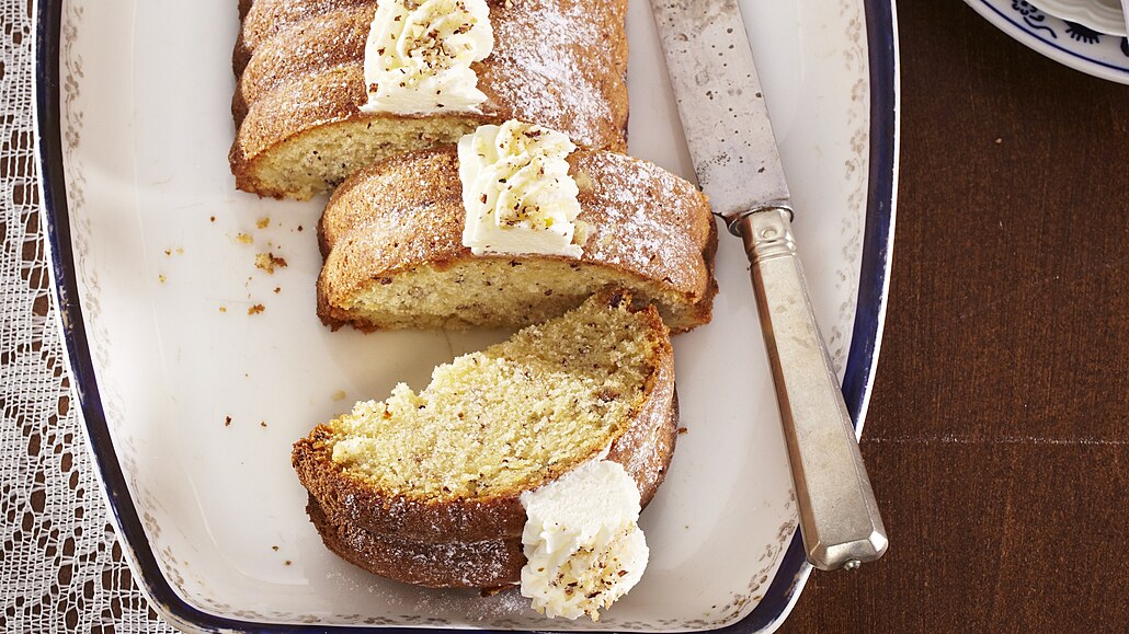 - Smetanu vyšleháme dotuha. Chlebíček pomocí cukrářského sáčku dozdobíme pusinkami šlehačky. Pusinky posypeme sekanými lístkovými oříšky a celý chlebíček pocukrujeme.