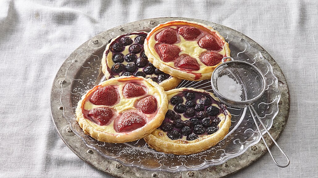 - Ovoce očistíme a překrájíme na menší kousky. Náplň rozetřeme rovnoměrně kousky těsta, poklademe je ovocem a pečeme v troubě vyhřáté na 180 °C asi 30 minut, dokud nejsou okraje koláčků zlatavé.