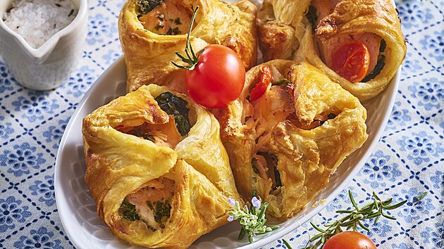 - Na těsto rozložíme špenát a poklademe kousky lososa, které na povrchu potřeme pestem a přidáme rozkrojená rajčata. Cípy těsta vždy složíme do šátečku a přitiskneme k sobě. Rozložíme na plech vyložený pečícím papírem a povrch šátečků potřeme rozšlehaným vejcem. Pečeme v předehřáté troubě při 180 °C asi 20 minut. Po upečení necháme vychladnout a podáváme.
