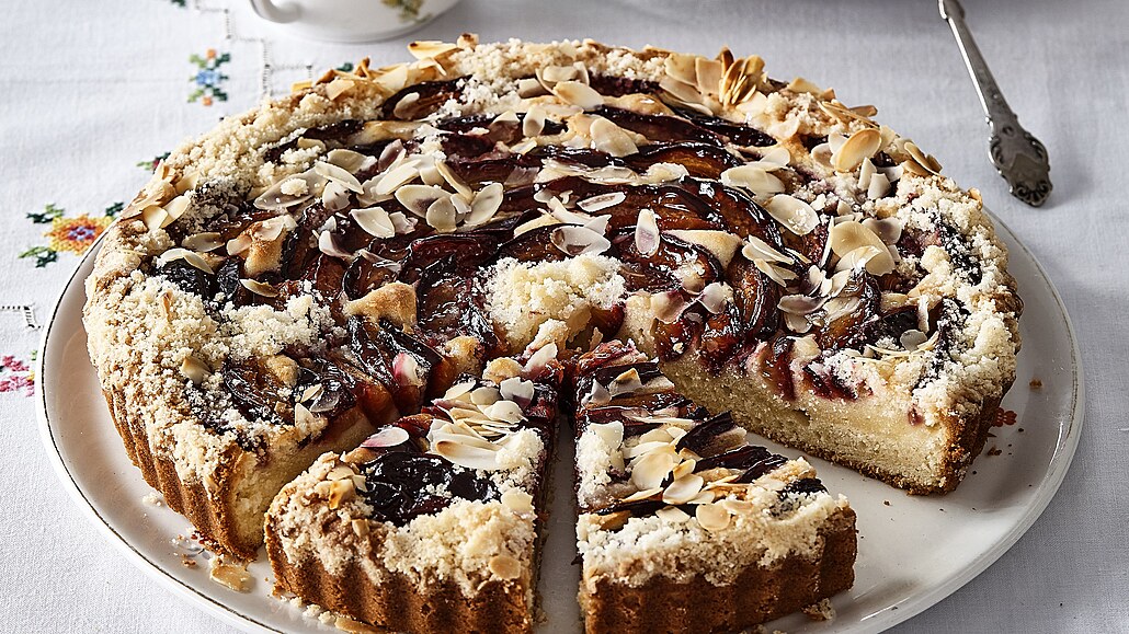 - Z másla, cukru a mouky vypracujeme drobenku. Povrch koláče posypeme nejprve jí a poté plátky mandlí. Pečeme v troubě předehřáté na 180 °C asi 45 minut. Po upečení necháme koláč krátce zchladnout ve formě a pak vyndáme na kovovou mřížku, kde necháme zcela vychladnout.