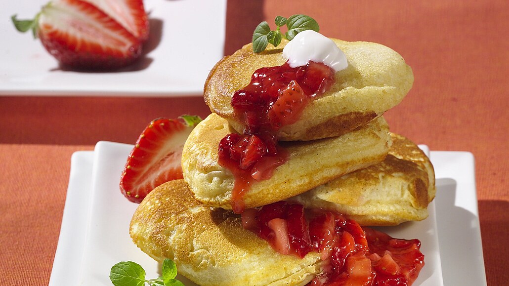 - Jahody nakrájíme na kousky a dáme do kastrůlku, přidáme moučkový cukr a necháme 10 minut ustát, jahody nám pustí šťávu. Takto připravené jahody dáme na sporák a ve vodě uvedeme do varu, poté stáhneme z ohně a necháme vychladit. Lívanečky poté podáváme s vychlazeným jahodovým pyré a bílým jogurtem, zdobíme čerstvými jahodami a lístky máty.