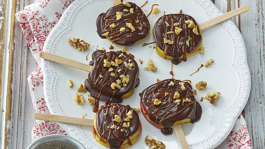 - Ve vodní lázni necháme rozpustit čokoládu. Přidáme lžíci másla, promícháme a hotovou polevou přelijeme připravená jablka.