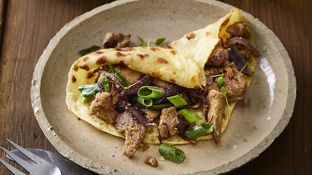 - Na náplň oloupeme červenou cibuli a nakrájíme ji na měsíčky. Játra odblaníme, omyjeme, osušíme a nakrájíme na menší kousky, které obalíme v hladké mouce. Jarní cibulku očistíme a nakrájíme na větší kousky. Tymián opláchneme a otrháme lístky.