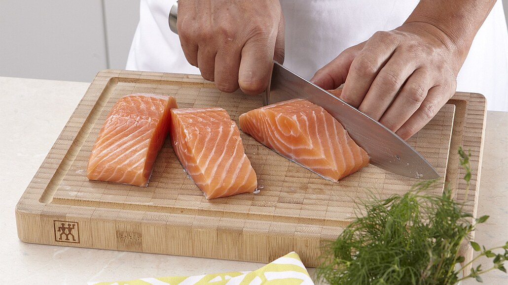 - Lososa očistíme (zbavíme šupin), opláchneme pod studenou vodou, osušíme a popřípadě pinzetou vykostíme. Filet nakrájíme na 8 plátků, které osolíme, opepříme a pokapeme citronovou šťávou. Dáme do chladu odležet.