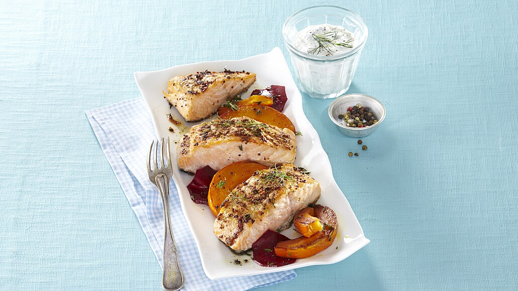 - Na pánvi rozpálíme olej a lososa opečeme. Dýni očistíme, omyjeme, odstraníme semínka a nakrájíme ji na řezy. Červenou řepu očistíme, opláchneme a nakrájíme na plátky.