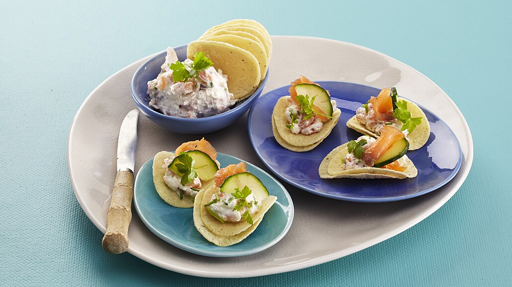 - Hotovou pomazánkou potřeme třeba chipsy. Dozdobíme je zbylým lososem, kousky okurky a petrželkou.