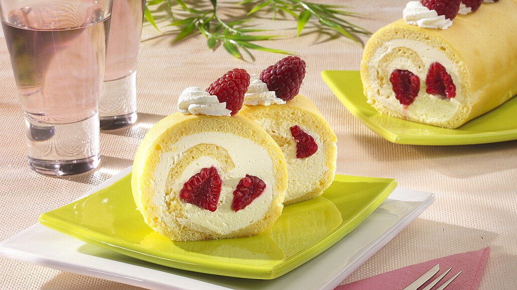 - Z vychladlého mandlového plátu odstraníme papír, korpus potřeme šlehačkovým krémem a posypeme částí malin. Stočíme do rolády, kterou necháme v chladničce zatuhnout. Pak ji ozdobíme zbylým krémem a malinami.