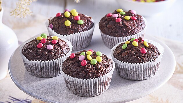 - Hotové těsto rozdělíme do formiček na muffiny vyložených pečicími košíčky. Na povrch nasypeme zbylé čokoládové pecičky.