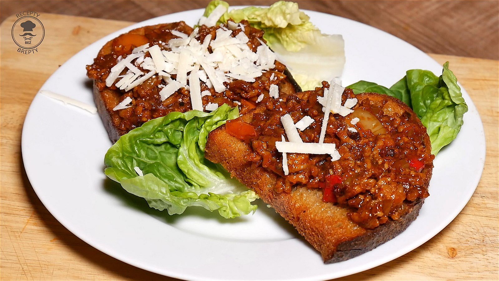 - Krajíce chleba osmažíme v oleji z obou stran, potřeme stroužkem česneku a poklademe masovou směsí. Nakonec posypeme strouhaným parmazánem a podáváme.