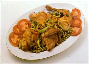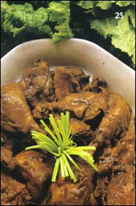 Kuře s kůží rozdělíme na malé kousky. Do většího kastrolu dáme olej a do horkého oleje vložíme kuře. Smažíme na prudkém ohni několik minut. Kousky kuřete stále obracíme. Vodu, kterou maso pustí, necháme vysmažit a pak přilijeme vodu. Přibližně deset minut vaříme maso na prudkém ohni. Potom přidáme všechny přísady, oheň ztlumíme a kastrol přikryjeme pokličkou. Maso dusíme ještě asi deset minut, než změkne a zčervená. Většina vody se odpaří a na dně kastrolu zbude právě tolik šťávy, kolik je potřeba k přelití porcí.