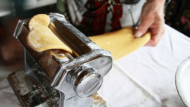 Připravíme si strojek na těstoviny a těsto vyválíme na tenké pláty. Pracujeme s několika pláty najednou, aby těsto nevysychalo. Plochu na válení lehce podsypáváme moukou nebo jemnou krupicí. Pokud těsto začne praskat, necháme ho 3–4 minuty odpočinout.