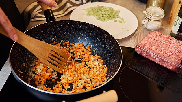 Přidáme všechno maso, rozmělníme a promícháme se zeleninou. Za častého míchání restujeme dalších 10 až 15 minut. Přidáme husté rajčatové pyré, cukr a sůl.
