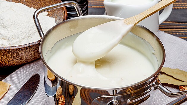 Nejprve zahřejeme mléko v rendlíku téměř k varu. V jiném hrnci pomalu rozpustíme máslo. Jakmile je máslo rozpuštěné, přisypeme prosátou mouku a metličkou vytvoříme světlou jíšku. Za stálého míchání vaříme 2–3 minuty, aby mouka nezůstala syrová, a poté postupně přiléváme horké mléko.