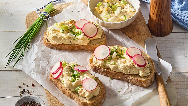 - Jarní cibulku očistíme a nakrájíme. Pomazánku navrstvíme na plátky chleba a posypeme cibulkou.