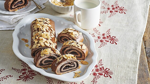 - Na lehce pomoučeném vále těsto vyválíme na obdélník silný asi 3 mm. Potřeme ho povidly (okraje necháme volné) a rovnoměrně posypeme mletými ořechy. Pevně stočíme do závinu a přeneseme na plech vyložený pečicím papírem, spojem dolů.