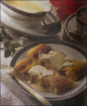 Ze žemlí nebo housek odkrojíme kůrku, nakrájíme je na kostičky a svlažíme mlékem. Máslo, cukr, žloutky a vanilkový cukr s nastrouhanou citrónovou kůrou ušleháme do pěny. Postupně přidáváme smetanu, kostičky žemlí a nakonec vpracujeme ušlehaný sníh z bílků. Touto náplní potřeme dvě třetiny vlažného těsta, posypame rozinkami, svineme do prstence, vložíme na vymaštěný plech, přelijeme jednou třetinou zálivky z ušlehaného vejce, mléka a cukru a pečeme v troubě 45 minut. Během pečení postupně přiléváme zbývající zálivku, takže se tento závin více vaří než peče. Podáváme teplý s vanilkovým krémem.