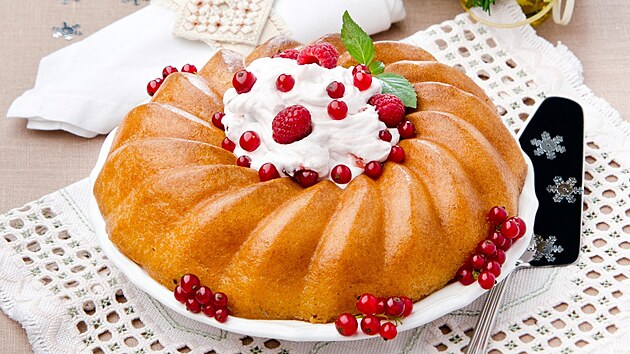 - Necháme odležet alespoň 1–2 hodiny. Před podáváním naplníme střed šlehačkou a ozdobíme ovocem.