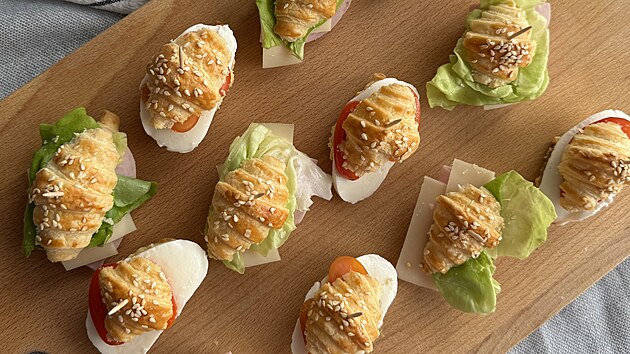 - Listové těsto rozválíme a nakrájíme na trojúhelníky, zatočíme do malých croissantů, potřeme vejcem, posypeme sezamem a pečeme cca 20 minut.