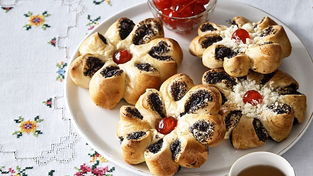 - Vykynulé těsto propracujeme a rozdělíme na 16 kousků. Z každého dílku vytvarujeme placičku, do jejího středu dáme lžíci makové náplně a zabalíme do bochánku. Necháme kynout asi 15 minut a poté rozválíme na kulaté placičky o průměru 12 cm. Po obvodu každé kousku uděláme 8 zářezů hlubokých asi 4 cm. Přendáme je na plech s pečicím papírem a každý vzniklý lístek otočíme o 90 °. Potřeme je rozšlehaným zbylým vejcem a střed ozdobíme kandovanou třešní (dle chuti můžeme střed každého koláčku nejprve ozdobit také např. drobenkou). Pečeme v troubě předehřáté na 180 °C asi 25 minut. Po upečení necháme vychladnout na kovové mřížce.