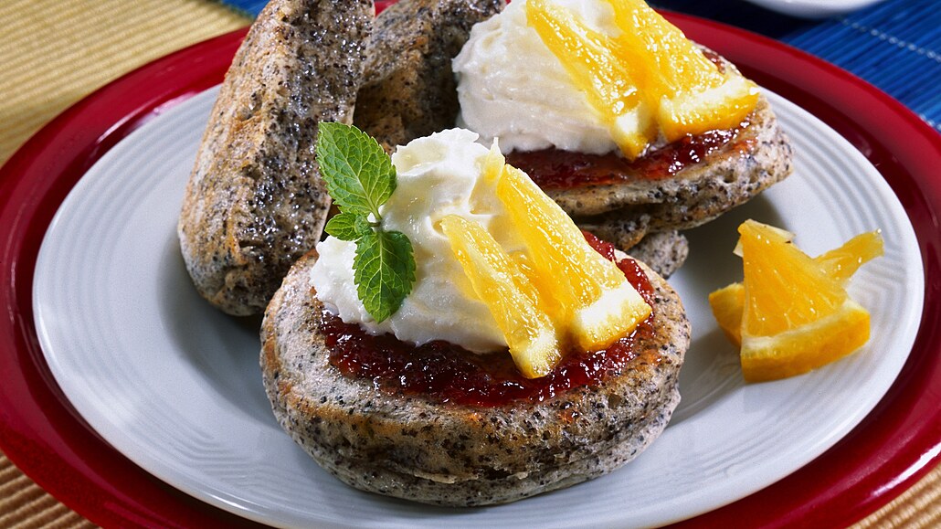 - Těsto lijeme na rozehřátý, olejem vymazaný lívanečník. Lívanečky upečeme po obou stranách dozlatova. Upečené lívance potřeme marmeládou a ozdobíme vyšlehanou smetanou a kousky pomeranče.