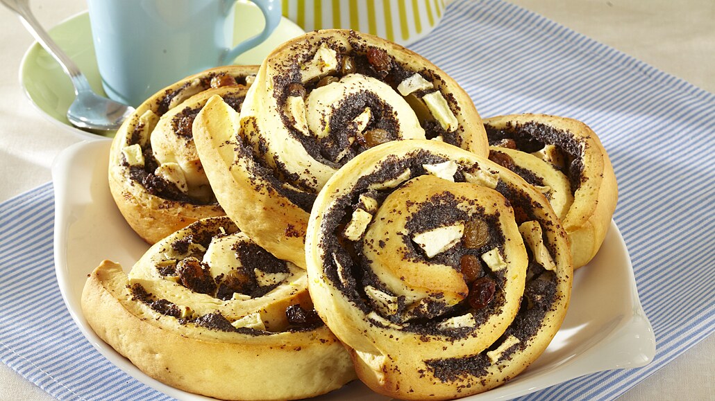 - Z těsta vyválíme obdélníkový plát a potřeme ho polovinou másla. Navrch rozetřeme makovou náplň (připravenou dle návodu na obalu) a rozprostřeme jablka. Vše pevně svineme do závinu.