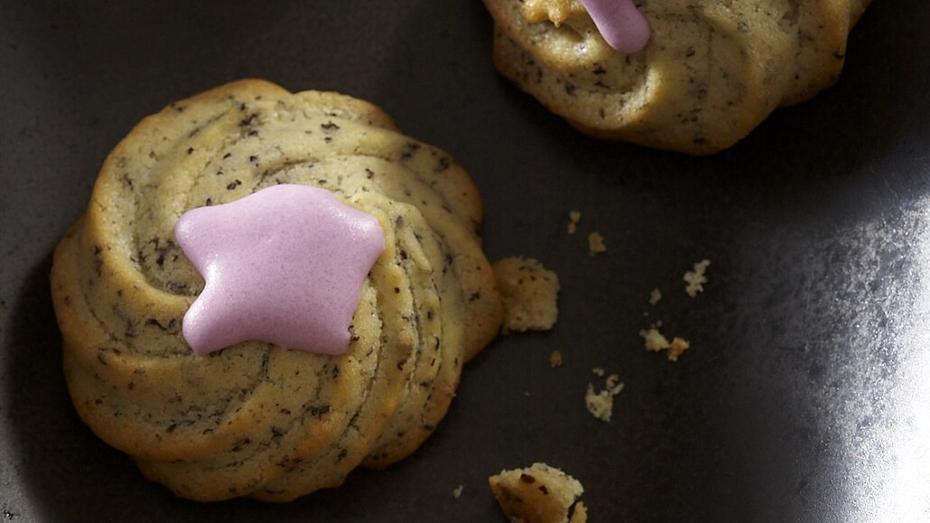 - Těsto naplníme do cukrářského sáčku s řezanou trubičkou a na plech vyložený pečicím papírem nastříkáme malé kytičky. Pečeme v předehřáté troubě při 180 °C asi 12 minut. Necháme na kovové mřížce vychladnout.
