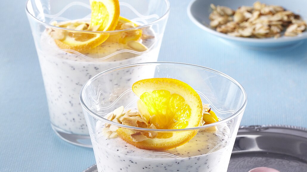 - Krém rozdělíme do skleniček a v lednici ho necháme zatuhnout. Před servírováním každou porci ozdobíme nasucho opraženými mandlovými plátky a plátky pomeranče.