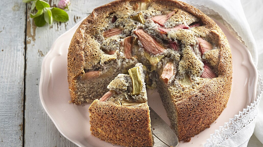 - Stonky rebarbory nakrájíme na kousky. Dortovou formu vymažeme tukem a vysypeme moukou. Vlijeme do ní těsto a uhladíme pomocí stěrky. Navrch dáme nakrájenou rebarboru.