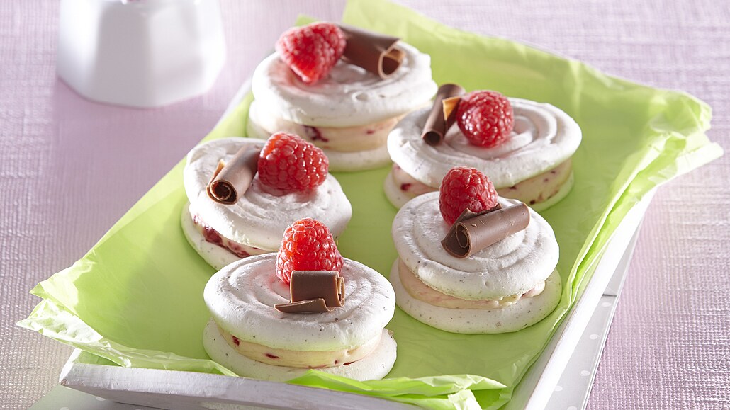 - Krém nastříkáme na polovinu oválků a slepíme je se zbylými oválky. Povrch ozdobíme malinami a čokoládovou hoblinkou.