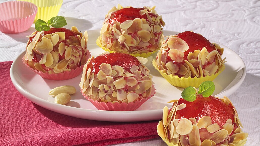 - Marmeládu rozehřejeme v kastrůlku. Do horké marmelády namáčíme slepené bochánky a strany obalíme v pražených mandlových lupínkách. Po zaschnutí marmelády naskládáme do papírových košíčků.